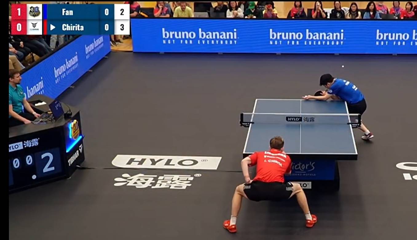 赛前训练时就感觉小胖和平时有了很大的区别,樊振东是经典的黑面正手,使用的是国产的狂飙蓝海绵,红面反手使用的是蝴蝶胶皮。这一次的对手是欧洲小将尤利安·奇里塔,这是两人第一次比赛,没有想到小胖就敢尝试新的打法,把红黑两面胶皮倒板互换,因为红色的胶皮更加适合德甲联赛的球台。