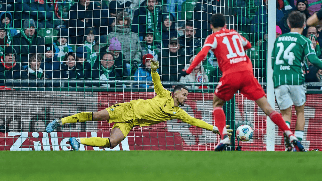 不来梅在退防过程中不可谓不积极,尤其是普埃尔塔斯从最初在中线附近逼抢穆西亚拉,接着换成全速追防戴维斯,最后又一路冲到底线处试图阻截迪亚斯,但最终徒劳无功。戈雷茨卡的射门也相当精妙,皮球正好从试图封堵的弗里德尔和利嫩之间的缝隙穿过再钻入球门左下角,又一次令奋力侧扑的巴克豪斯无可奈何。