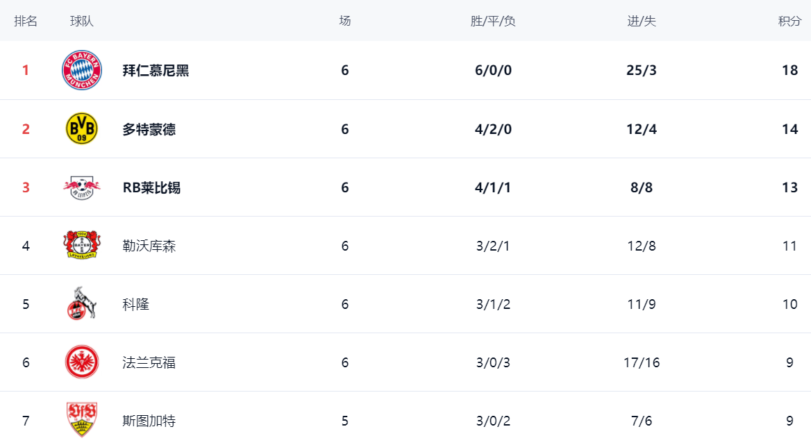积分榜上,拜仁以六战全胜的傲人战绩,积18分高居榜首,展现了他们强大的统治力。多特蒙德在战平莱比锡后,以14分排名第二。莱比锡积13分,位列第三。勒沃库森以3胜2平1负的战绩,积11分排名第四。科隆积10分,排名第五。法兰克福和斯图加特同积9分,分列第六和第七位。