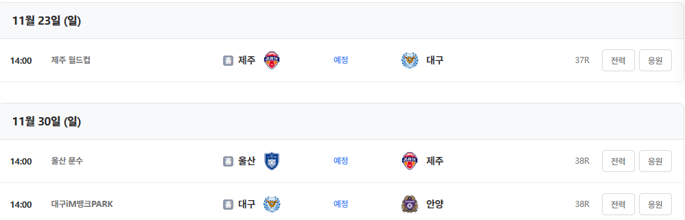在季后赛名额只剩下两个的情况下,全南、衣恋、城南将会有一支球队最终功亏一篑。最后一轮,城南主场对釜山,首尔衣恋主场对安山,只有全南是客场打忠南牙山,这三场比赛也将同时开球,最后一轮,谁的眼泪在飞呢?