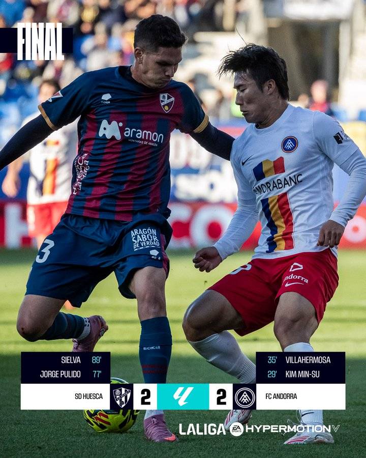 最后我们来看欧洲赛场韩国球员的表现。从周五到周六,共有15名球员登场,其中一名球员完成进球,一名球员完成赛季首秀,下面我们来分别看看一些焦点球员的本轮表现。首先是西乙舞台,之所以将这个联赛提到本新闻的头条,是因为西乙安道尔的韩国小将金旻洙又有进球!在2025-26赛季西乙第13轮比赛客场与韦斯卡的比赛中,以左边锋身份出战的金旻洙不仅表现出色,并且在第28分钟接到队友的传球后,在区外轰出一脚世界波,皮球直挂对手球门死角,为球队取得领先,这也是小金本赛季的第三球。6分钟过后,金旻洙逼抢对手后卫导致其失误丢球,队友截断皮球后,将球吊入空门。