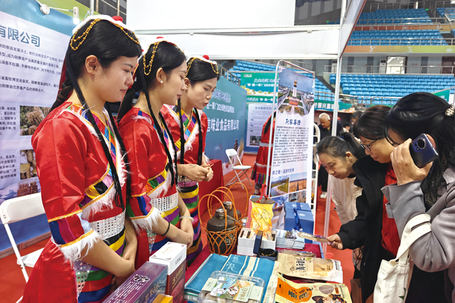 在东西协作展区,来自青海刚察的推介人员身着特色民族服装,向群众介绍区域特色产品