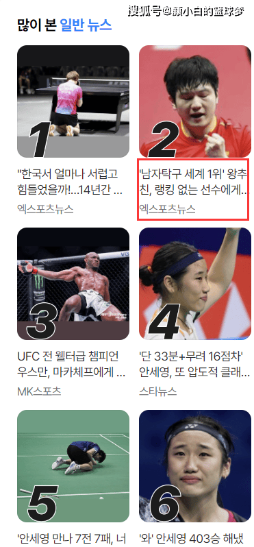 打开韩国媒体网站,大家可以看到樊振东竟然在热搜第二的位置,这已经是这周第二次了,第一次是樊振东男单半决赛击败王楚钦、决赛击败林诗栋后(连胜世界第一、世界第二)卫冕全运会男单金牌,第二次就是男团决赛再度击败王楚钦。