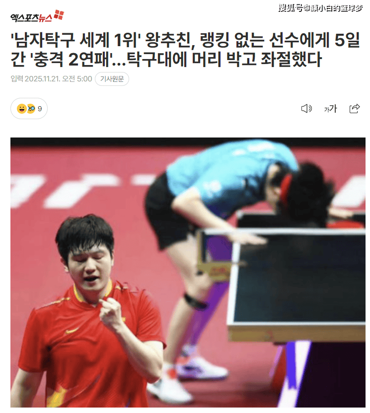 北京时间11月21日,韩媒《世博新闻》写道:没有世界排名的樊振东在短短五天内第二次击败了世界第一的王楚钦,世界第一遭遇连败后信心受挫一头撞在球台上。