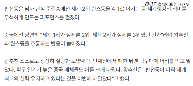 韩媒写道:世界第一耻辱的一天,他在全运会男团决赛出了大丑,他自己撞了球台。这是男单世界第一王楚钦的故事,他在五天内连续两次输给一位没有世界排名的选手(樊振东),王楚钦一直以来都被视为中国男乒的明星选手,但退出世界排名在德甲打球的樊振东似乎才是最强的。