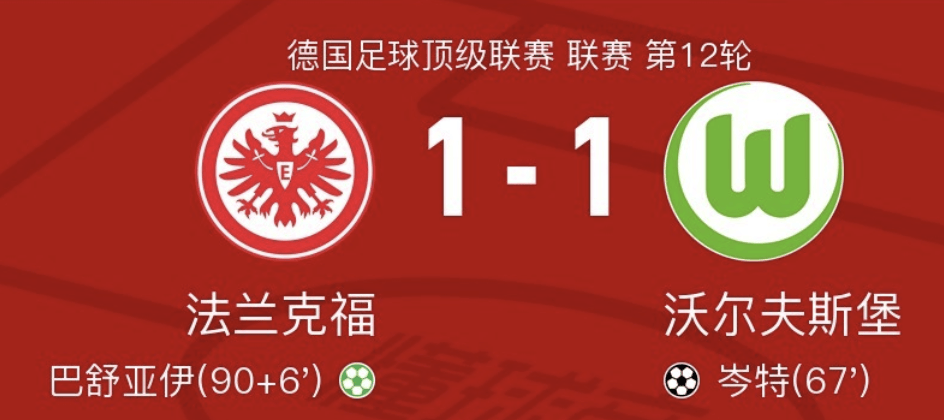12月1日,德国足球甲级联赛第12轮,法兰克福坐镇主场迎战沃尔夫斯堡。比赛中,沃尔夫斯堡由岑特接昆贝迪助攻率先取得进球。随后,法兰克福球员巴舒亚伊在下半场补时阶段主罚点球命中,帮助球队扳平比分。最终双方以1比1握手言和。