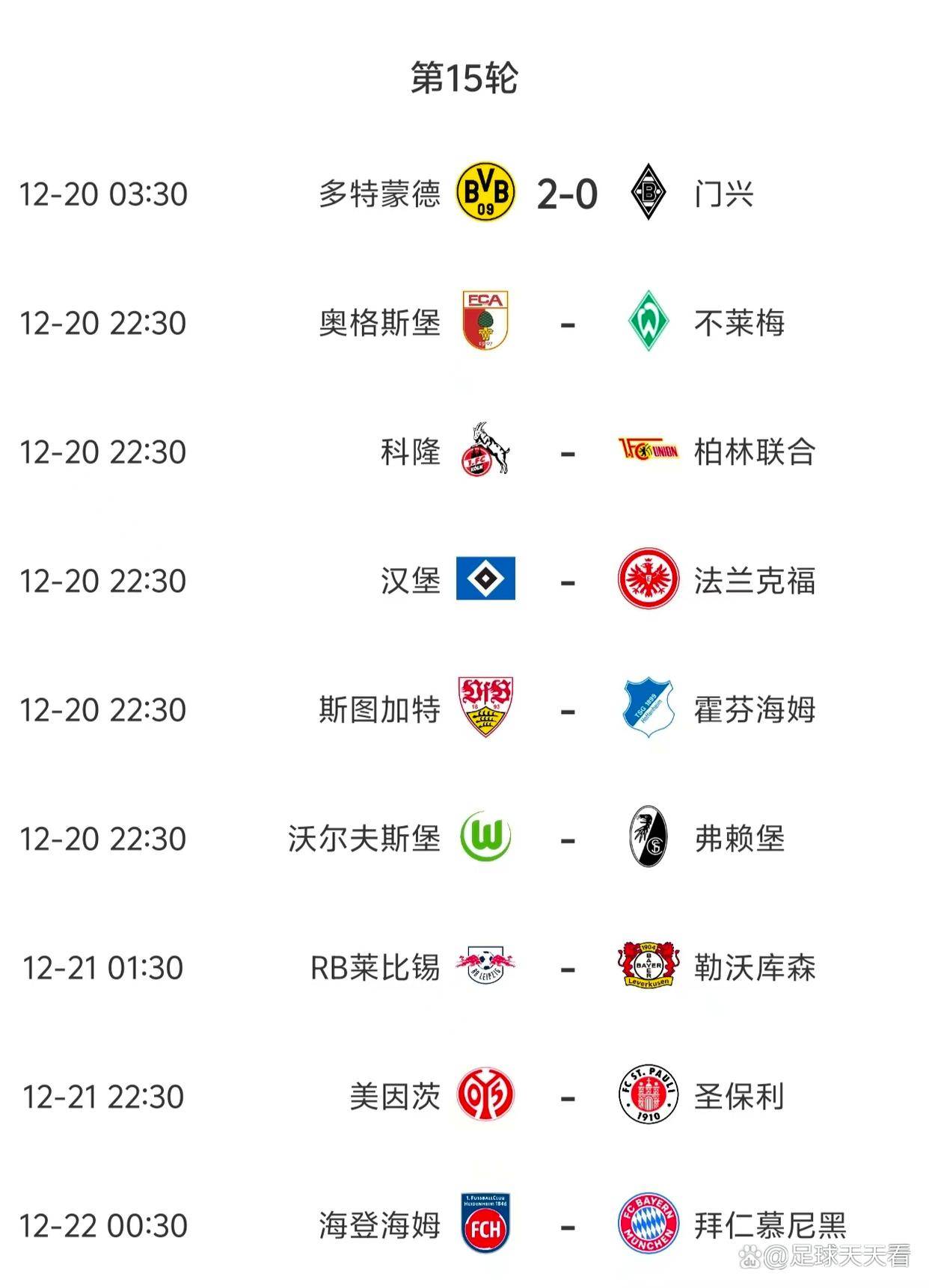 昨晚,德甲第15轮率先进行了一场比赛,多特蒙德在主场以2比0的比分力克门兴,再次证明了他们一周单赛时的强大实力。接下来,让我们将目光投向本轮的其他精彩对决: