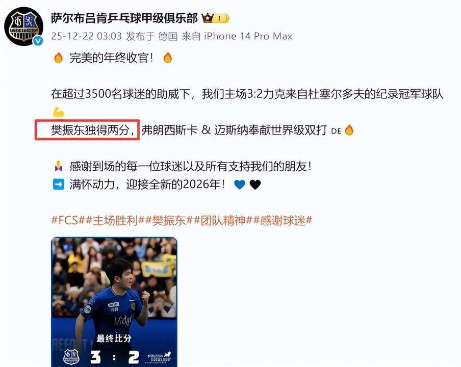 从未见过欧洲联赛有今天这样的阵仗。 萨尔布吕肯俱乐部官方社交平台赛后直接让樊振东以90%得票率当选最佳球员。