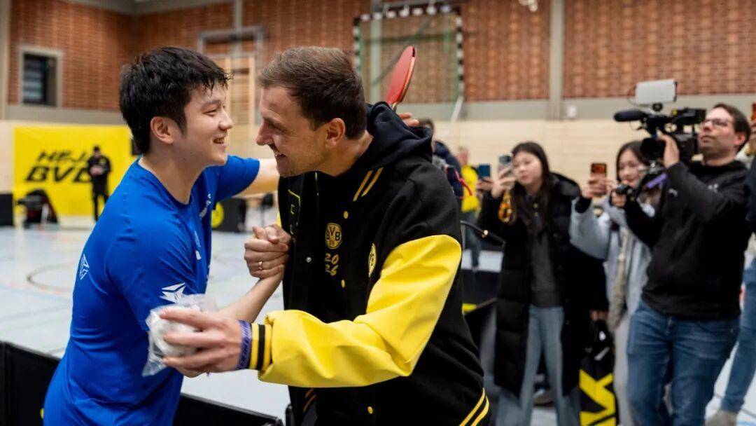 比赛当日,尽管萨尔布吕肯远赴客场,但主场DJ依旧延续了该队特有的“中文应援”传统,赛前特意为樊振东播放了脍炙人口的歌曲《海阔天空》,足见樊振东在队内的核心地位。现场,传奇名将波尔亲自到场观战,并与樊振东热情拥抱致意,萨尔布吕肯俱乐部经理更是全程陪同樊振东进行热身和离场,对其重视程度可见一斑。
