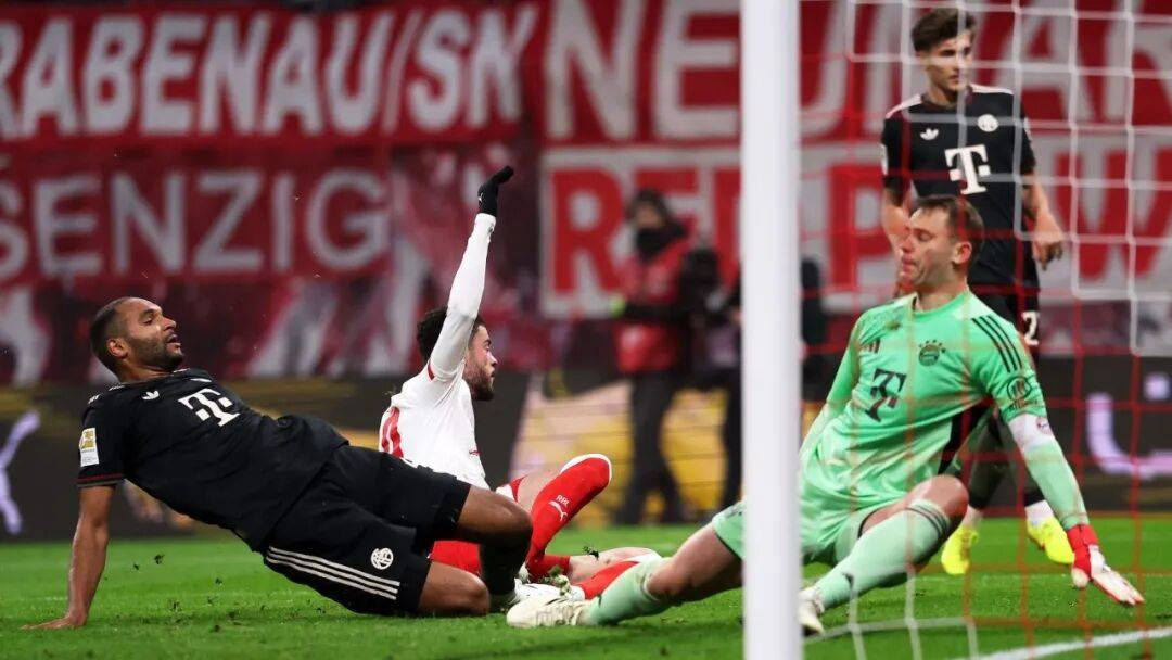对于拜仁来说,不幸中的万幸在于,努萨尽管一对一面对比朔夫予取予携,总能为队友送出妙传,但当要由自己来终结时却总是鬼使神差地脱靶,包括第24分钟时突入禁区右肋面对诺伊尔一脚打高。当然,这个球如果打进了,VAR理应介入,因为明明是迪亚斯在对方禁区前沿接球时被巴库扫倒在先,主裁判萨沙·施特格曼却不予理会,这才有了莱比锡的由守转攻。