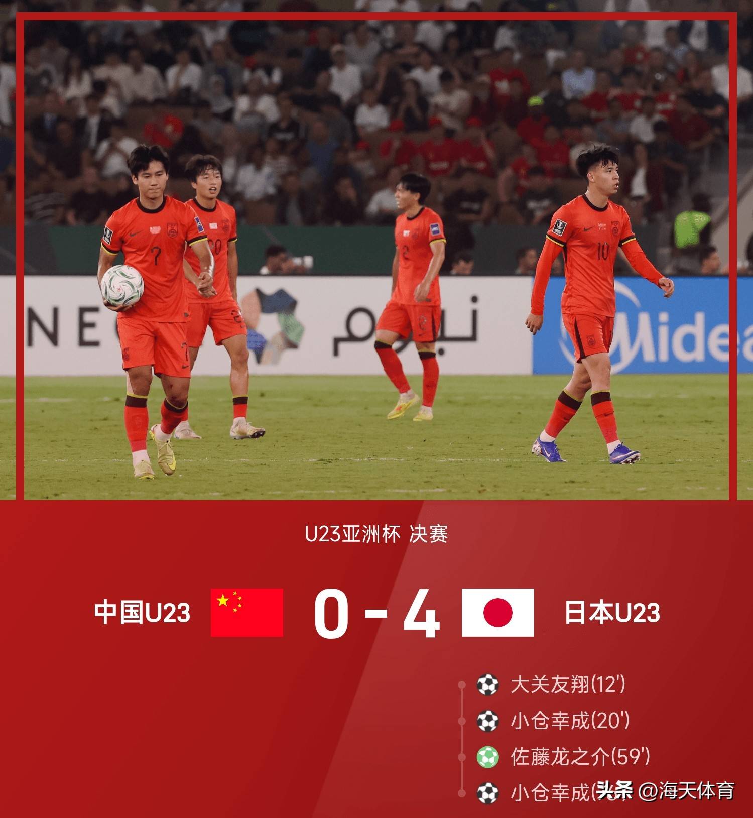下半场比赛,刘浩帆手球送点!第57分钟,古?柊介禁区右侧倒三角回敲打在刘浩帆的手臂上,通过VAR,裁判判罚点球!佐藤龙之介主罚点球一蹴而就,U23国足0-3日本!杨希进球越位!第68分钟,鲍盛鑫远射被封堵,胡荷韬禁区内再推射被荒木琉伟扑出,杨希补射破门,裁判示意杨希越位,进球无效,第76分钟,横山梦树边路过人后传中,胡荷韬解围到禁区前沿,小仓幸成跟进远射,皮球打在鲍盛鑫腿上折射入网,U23国足0-4日本!