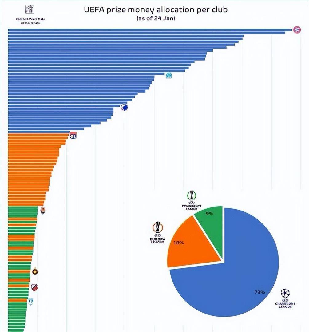 欧冠联赛自2024/25赛季起采用新赛制,36支参赛球队在联赛阶段进行更多比赛,意味着奖金分配将进一步向豪门俱乐部倾斜。
