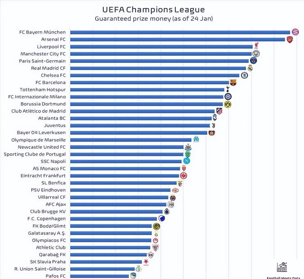 这些计算还未包含所谓的“价值奖金”和门票收入。 价值奖金基于俱乐部的欧足联系数和各自所在的电视市场确定,这对拜仁这样的传统豪门尤为有利。