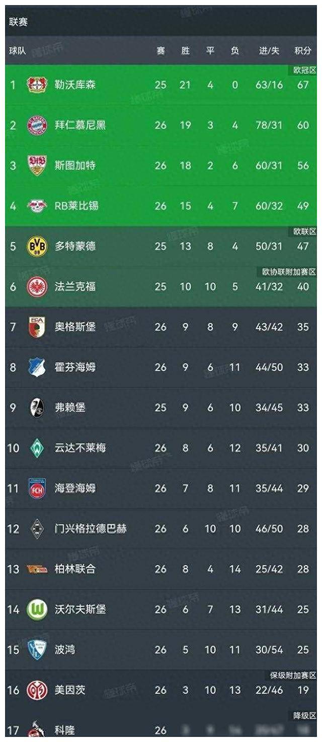 这轮比赛结束后,德甲积分榜愈发混乱。尽管拜仁获胜,但追赶领头羊仍需要付出更多努力。斯图加特和RB莱比锡势头强劲,争冠形势愈发扑朔迷离。而争夺第四名的竞争更加激烈,几支球队势均力敌,一场胜负可能改变版图。