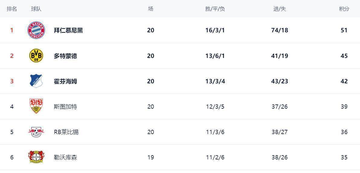 德甲第20轮全部战罢。拜仁慕尼黑以51分继续领跑积分榜,多特蒙德以45分紧随其后,霍芬海姆42分排名第三,斯图加特39分位列第四。保级区方面,海登海姆和圣保利分别以13分和14分处于降级区,美因茨18分排名倒数第三。
