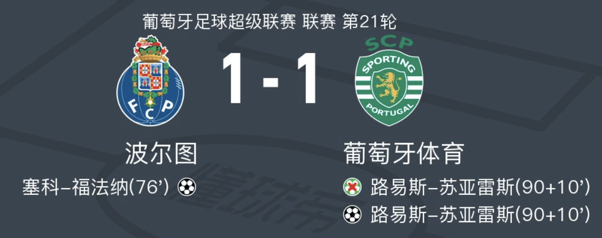 2月10日葡萄牙足球超级联赛 联赛 第21轮,波尔图主场对阵葡萄牙体育。波尔图塞科-福法纳破门。葡萄牙体育路易斯-苏亚雷斯破门。最终比分波尔图 1-1 葡萄牙体育。2月9人发的四场足球都对了,里斯本竞技不败打票让负还有比分1-1都对了,罗马主胜还有小比分还有比分2-0都收了,新月客场爆冷看好主队不败打票让胜也对,还有比利亚雷主场取胜也对了,开开心心;返回搜狐,查看更多