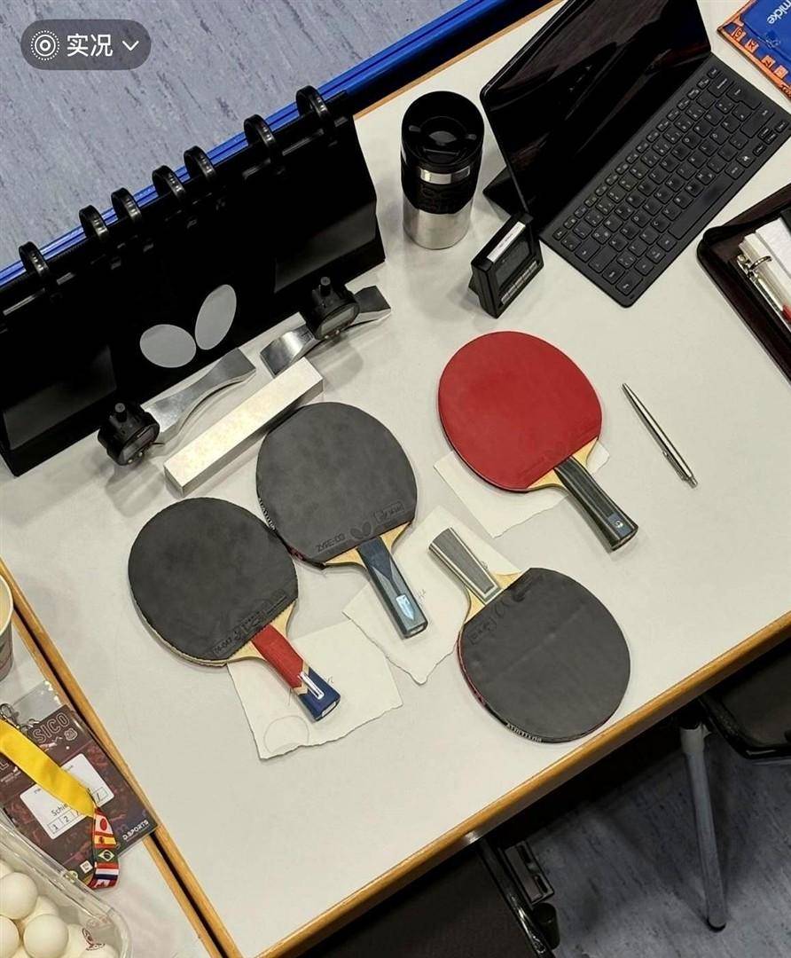 这事儿得从球拍本身说起。 樊振东用的这块底板,是蝴蝶公司专门给他开的生产线,型号就叫樊振东ALC。 五层木加两层芳碳的混合结构,爆发力够猛,推挡手感还脆爽。 正手配的是NEO蓝国狂套胶,反手是蝴蝶D09c,这套组合跟着他从奥运会一路打到德国联赛,胜率摆在那儿。 裁判拿着拍子,拇指在胶皮上轻轻摩挲,嘴里还念念有词,那眼神根本藏不住对这块装备的兴趣。