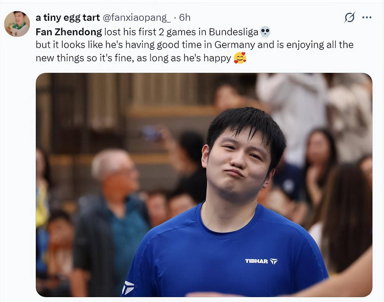 此外,外国观众还发现了一个细节,虽然樊振东在德甲首秀中遭遇两连败,但没有表现出沮丧的情绪,反而显得十分开心,享受着其中的乐趣。输球并不重要,最重要的是保持开心的心态。
