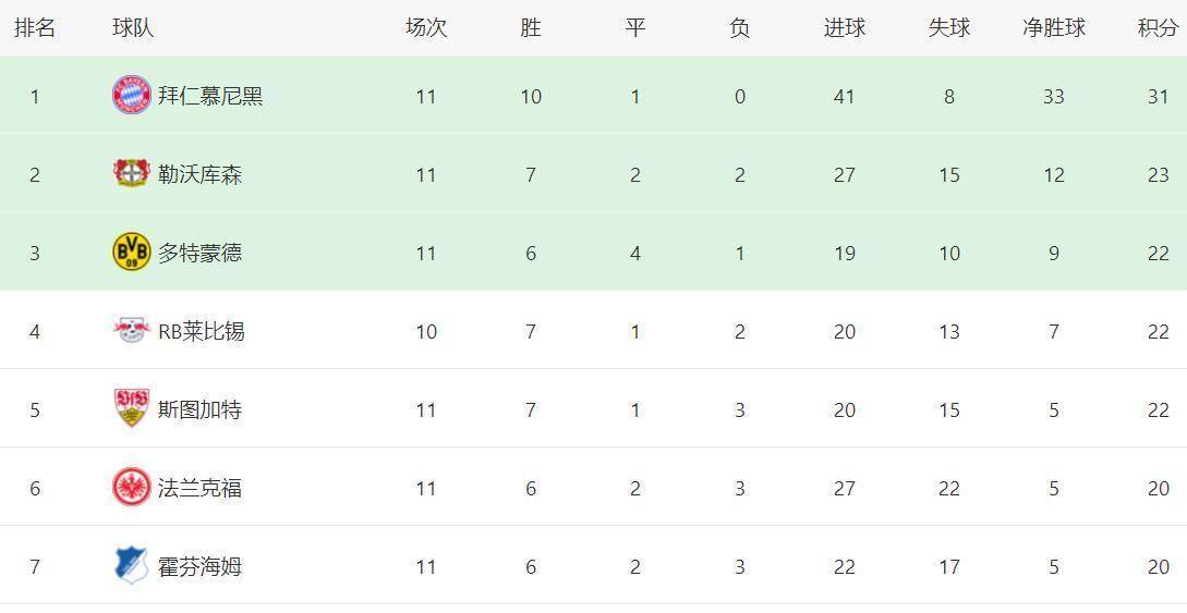 积分榜上,拜仁以31分遥遥领先。 勒沃库森23分排名第二,多特蒙德、莱比锡和斯图加特同积22分,分列三至五位。 法兰克福和霍芬海姆同积20分,紧随其后。